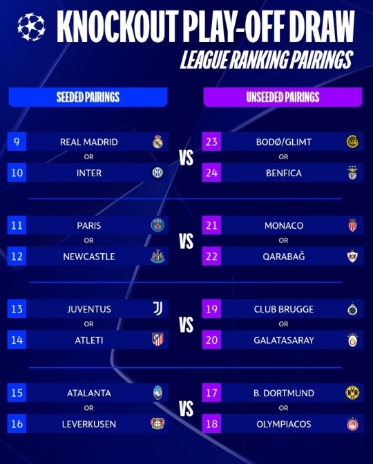 北京时间今晚19:00,欧冠淘汰赛附加赛抽签在瑞士尼翁进行,本次抽签涉及联赛阶段排名第9至第24的16支球队。