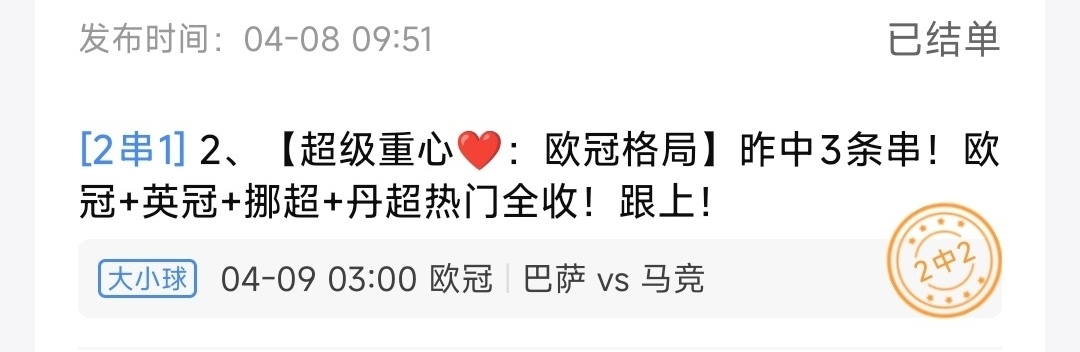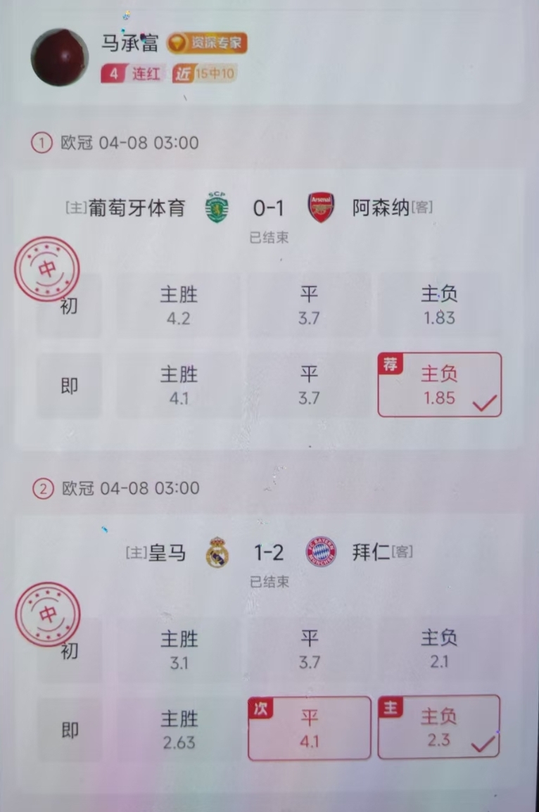 看图思考:反正欧冠1/4决赛首回合两晚都中2串!今晚2串更新...