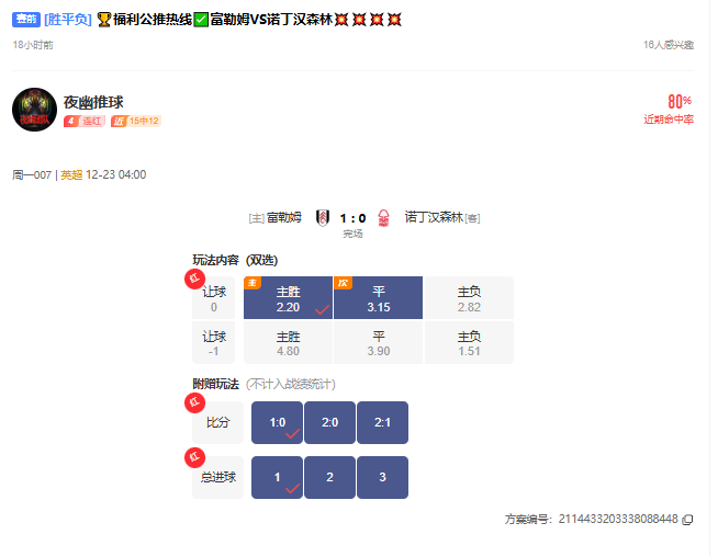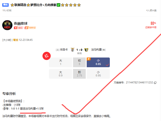 昨日夜幽精选8场,6红1走1黑,英超拿出来做福利公推,同样稳稳拿下,(详细可看下面图文内容解析),夜幽方案讲究稳+准+狠,方案推断精准到位,每周胜率保持在70%-80%,超强稳定,好方案不贵,只需要58与你一起嗨!直播间赛事有料免费共享,有兴趣的朋友也可以时刻光临一起享受高潮的感觉!!!